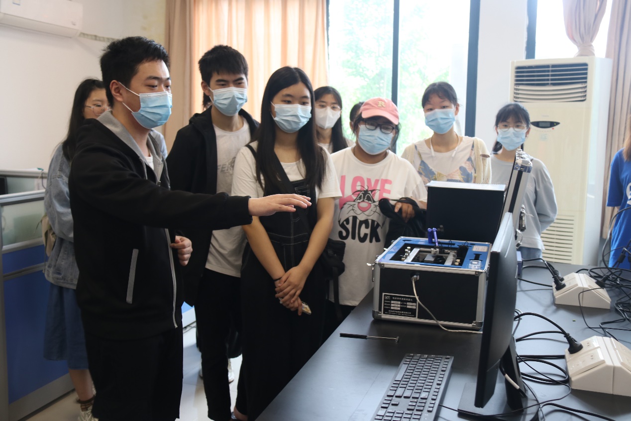 随后,重点实验室副主任曾召益教授安排大家分组,按序观摩各个实验项目。分别是磁电特性研究室、测试物质结构研究室、先进金属材料与非晶态物理研究室、先进金属材料与非晶态物理研究中心实验室、激光和水下光通信方向研究室等。各项目实验室由专任教师或研究生向参观者详细介绍了实验室的日常工作,并为大家演示了部分实验仪器的操作方法、讲解了仪器的工作原理,也向参观的同学们展示了各自领域取得的科技创新成果,引起了同学们浓厚的兴趣。