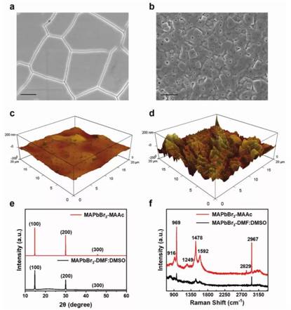 从前驱体溶液化学的角度出发,采用离子液体溶剂醋酸甲铵(MAAc)一步法空气处理工艺制备了高质量的MAPbBr3钙钛矿型薄膜。形成的无针孔、均匀、致密的MAPbBr3钙钛矿薄膜在纳秒激光下产生了高发射效率、低阈值的优良放大自发辐射(ASE)。此外,所制备的MAPbBr3钙钛矿具有优良的双光子诱导ASE,在800 nm飞秒激光激发下,其低阈值为100 µJ cm-2。更重要的是,与传统的用N,N-二甲基甲酰胺(DMF)和二甲基亚砜(DMSO)制备的MAPbBr3薄膜相比,用MAAc制备的MAPbBr3薄膜具有优异的光学稳定性:在超过2小时的脉冲激光激发下没有降解迹象,在95%湿度条件下,薄膜能产生稳定的ASE发射光谱,在空气中放置6000小时以上,薄膜也能产生稳定的ASE发射光谱。