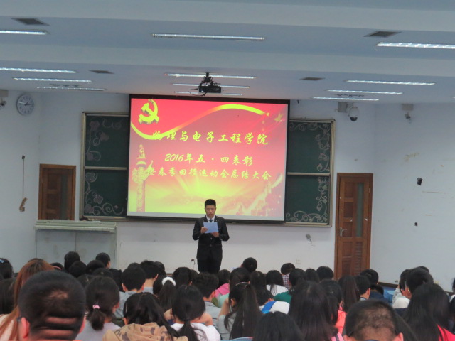 于2016年4月29日在弘德楼15205室举办了2016年五四表彰大会暨春季田径运动会总结大会。物电学院党委副书记冉久飞和团总支书记李青松老师携物电学院全体辅导员以及学院学生参加此次大会。