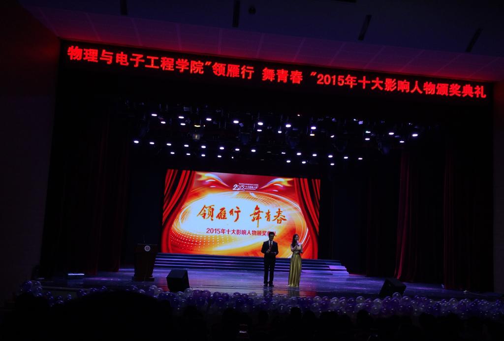 2015年“领雁行,舞青春”十大影响人物颁奖典礼在校友会堂隆重举行。学校职能部门领导、学院党政领导、系主任、专业课教授、辅导员及全体物电学院学生参加了本次颁奖典礼,共享成果与感动。