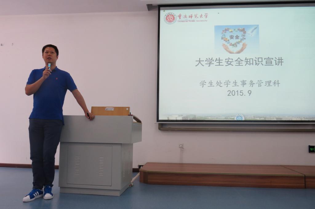 在2015年9月13日下午14:30举办了一场关于大学生安全知识的讲座,重师学生事物管理科李鑫老师担任了此次讲座的主讲人。