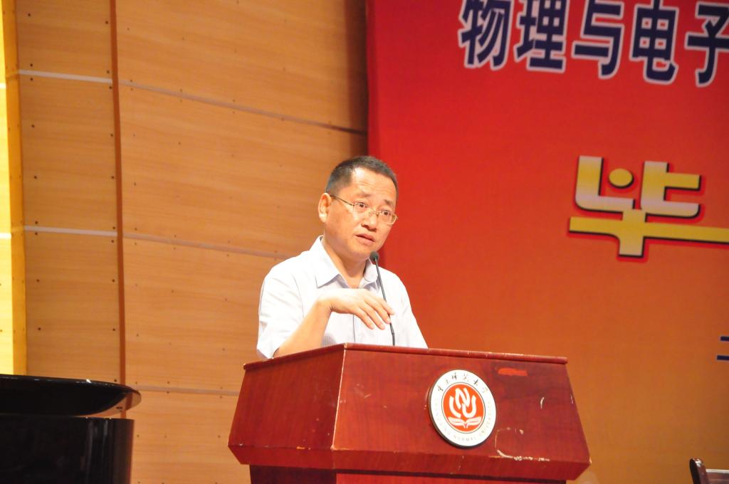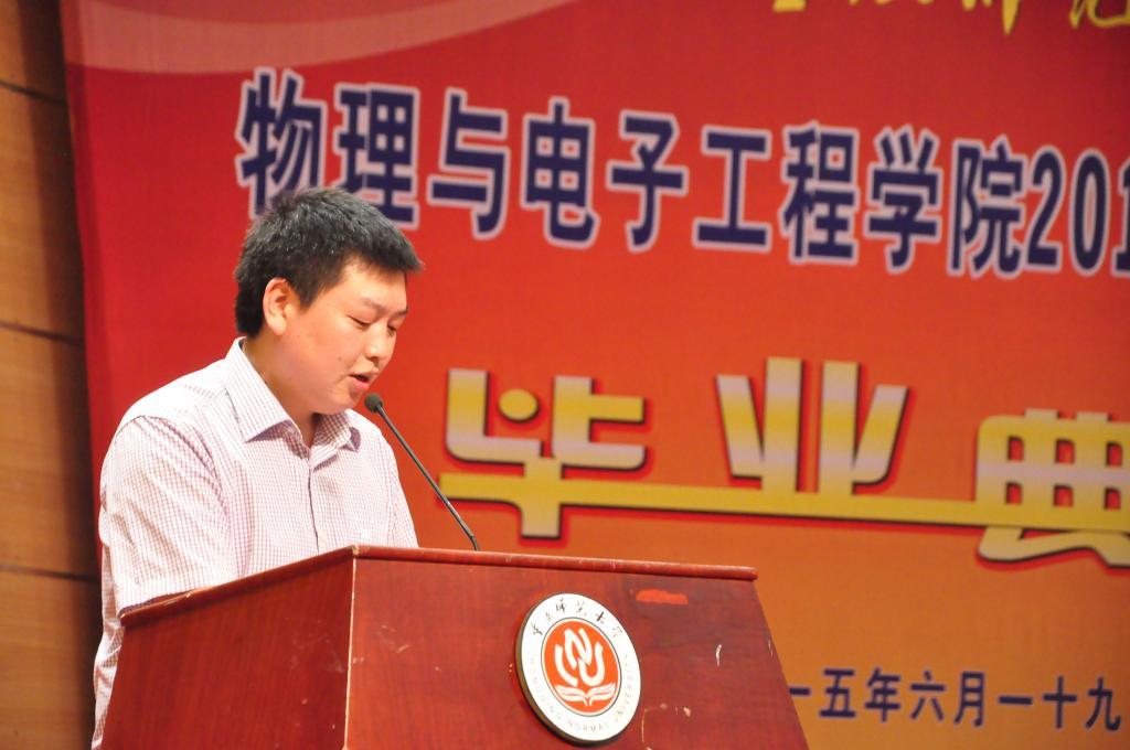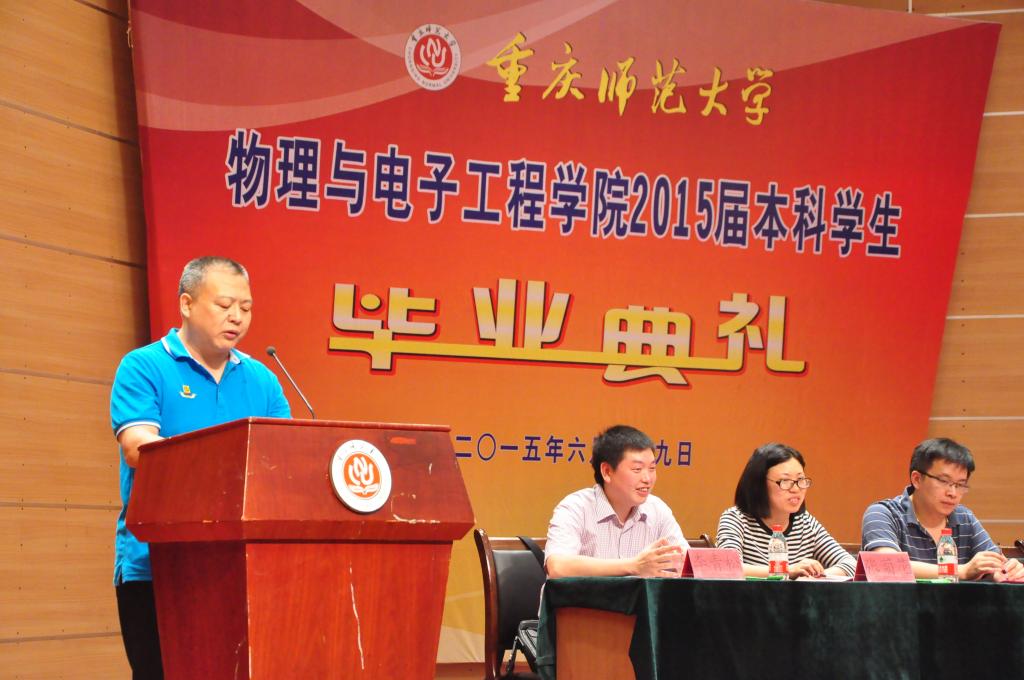 毕业生代表发言后,冯庆教授代表物电学院全体教师发言,他表达了全体教师对2015届毕业生顺利毕业的祝贺和对未来的祝福。随后便是以马良为代表的低年级同学们献词,表达了对学姐学长们的祝福之情。接着,物电学院院长崔玉亭教授为毕业生们致辞,道出了学院对2015届毕业生们诚挚的祝福和期盼,并让即将离开校园的同学时刻记住重师“学高为师,身正为范”的优良校风,以此提醒自己约束自己。到这里,毕业典礼已经接近尾声,毕业生们向学院献礼,并全体起立高唱韩国h漫