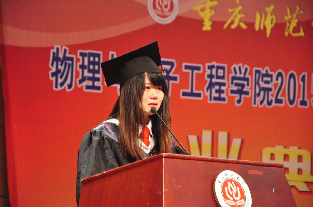 授位仪式结束后,毕业生代表张婉君上台发言,张婉君大学三年都在物电学院学生会为老师和同学服务,物电学院里有她太多的记忆。她真挚的发言让我们看到了她大学四年的成长和褪变,她的每一次失败,每一次的不懈努力,以及对母校深深的不舍不舍之情。她如此,物电学院2015届全体毕业生更是如此,他们用辛勤的劳动、顽强的精神、不懈的努力谱写了他们无悔的青春!