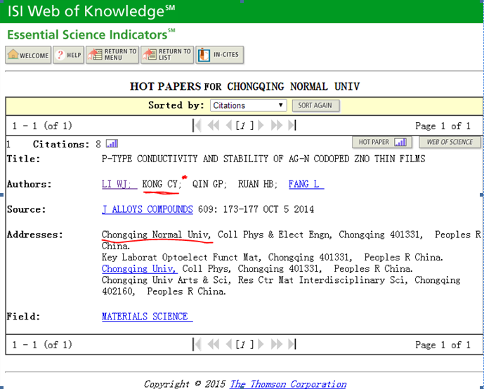 为第一单位于2014年发表在《JOURNALOF ALLOYS AND COMPOUNDS》上的学术论文《P TYPECONDUCTIVITY AND STABILITY OF AG-N CODOPED ZNO THIN FILMS》入选ESI热点论文(ESIHot Papers),标志韩国h漫
