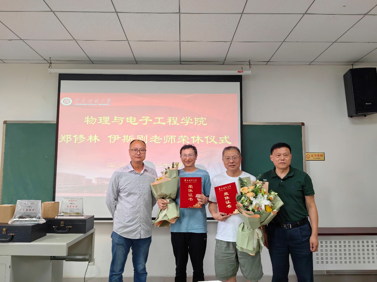为传承物电学院尊师重教的优良传统,引导青年教师不忘初心、砥砺前行,6月29日下午,物电学院全体教职工齐聚集贤楼531,为伊斯刚、郑修林老师举行隆重而温馨的荣休仪式,仪式由物电学院工会主席范嗣强主持。