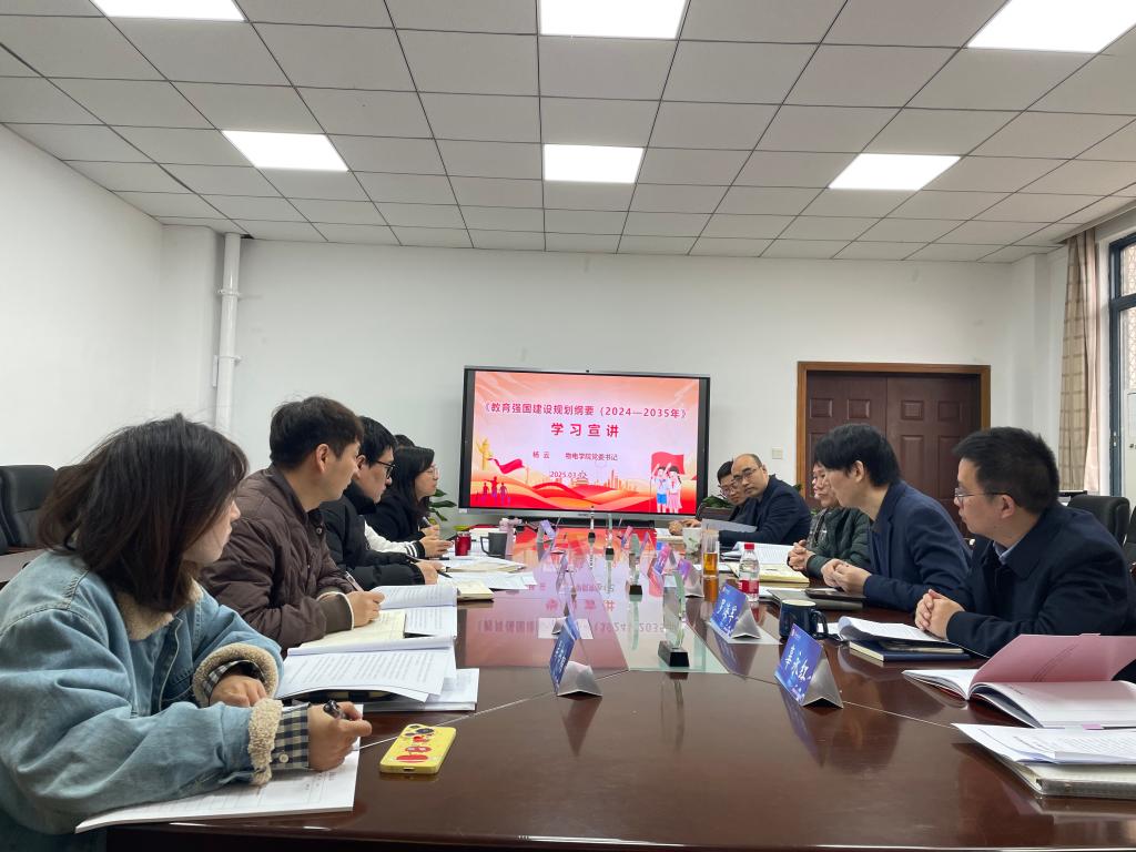 杨云书记对学习会进行总结,提出三点重要求。首先,在理论学习方面,中心组成员要认真研读《纲要》文件,深刻领会其中的精神实质和核心要义,不仅要做到自身学深悟透,更要在会后以清晰、准确的方式将纲要内容传达给全院师生,确保师生也能充分了解相关政策和要求。其次,在实践落实方面,不能将学院的发展思路孤立看待,而应紧密结合国家及地方的政策导向,要敏锐捕捉政策中的机遇,积极调整学院的发展策略和工作重点,将政策优势转化为学院发展的强大动力,实现学院发展与国家、地方发展同频共振。最后,在学科建设和人才培养上,他着重强调,学科建设是学院发展的基石,人才队伍是推动学科建设的关键力量,必须给予高度重视,要积极营造良好的人才发展环境,为学院的长远发展提供坚实的基础。