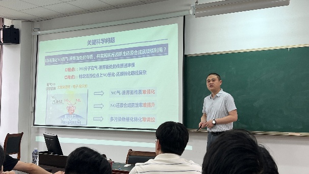 李解元教授在报告中对利用太阳能作为外部驱动力,激发催化剂产生大量自由电荷,以强氧化-还原能力实现大气污染物的深度净化和增值转化等研究工作进行了系统的介绍。重点对1)NOx跨介质传输效率低,污染物转化率难提升;2)NOx氧化-还原转化路径复杂,产物选择性难调控这两个NOx光催化转化的关键科学问题进行了深入剖析并介绍了相关研究工作。报告结束后,与会师生就报告中的诸多材料设计、关键科学问题凝练等进行了热烈讨论,李教授对与会师生提出的问题耐心解答,并分享自己的科研工作心得,报告会现场氛围热烈。