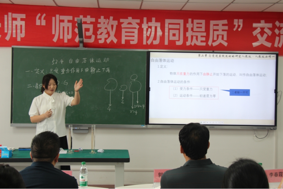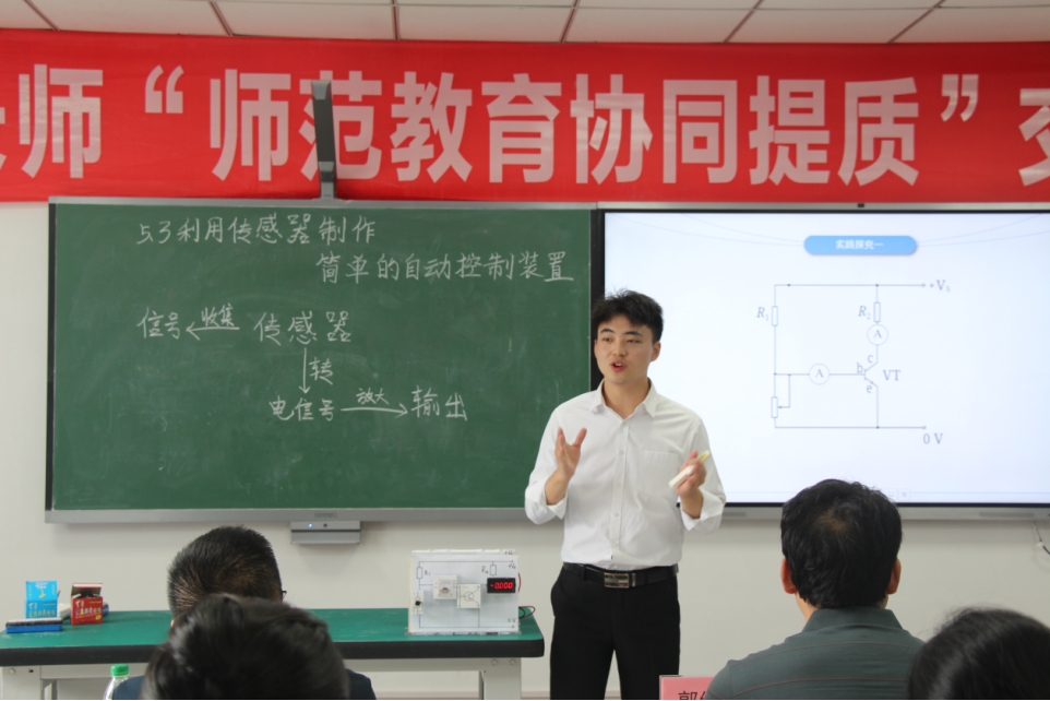 2名22级物理师范本科生紧扣学科重难点,分别以《光的偏振》、《动量定理》为课题,凭借扎实的专业功底与创新的教学设计,将晦涩的物理原理转化为生动的课堂呈现;“重师-长师协同提质联合培养”学生则围绕《自由落体运动》展开精彩展示,以清晰的逻辑和巧妙的实验设计,充分展现跨校联合培养的教学成果。长师3名学生分别围绕《热机的效率》、《电能的输送》、《利用传感器制作简单的自动控制装置》三大课题,通过理论讲解与实践演示相结合的方式,展现出对知识的深刻理解与创新应用能力。展示结束后,学生们逐一分享实验设计思路,老师们根据展示内容与实验分享展开热烈探讨,在思维碰撞中深度挖掘教学技能展示背后的创新理念与实践价值。