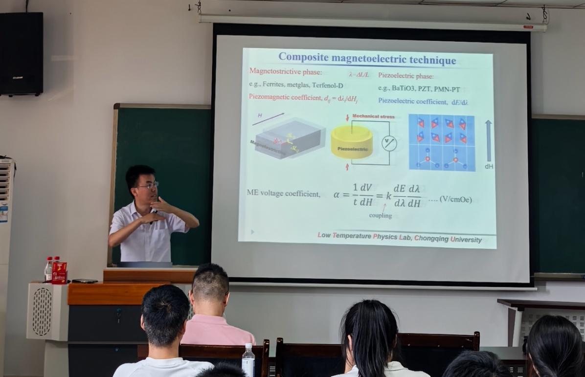 开展学术交流活动,分别作了题为“磁电学:从基础到应用”和“复合磁电耦合方法:一种普适的超高精度低温强磁场测试技术”的学术报告。本次学术交流活动由教务处副处长毋志民教授主持,物电学院相关专业师生参加。