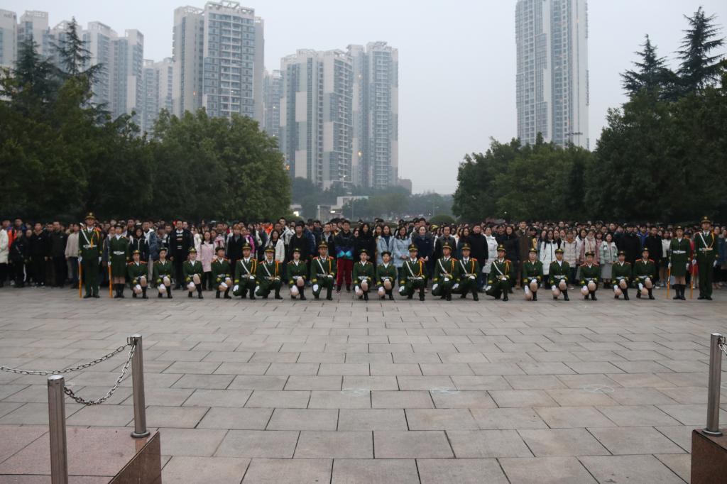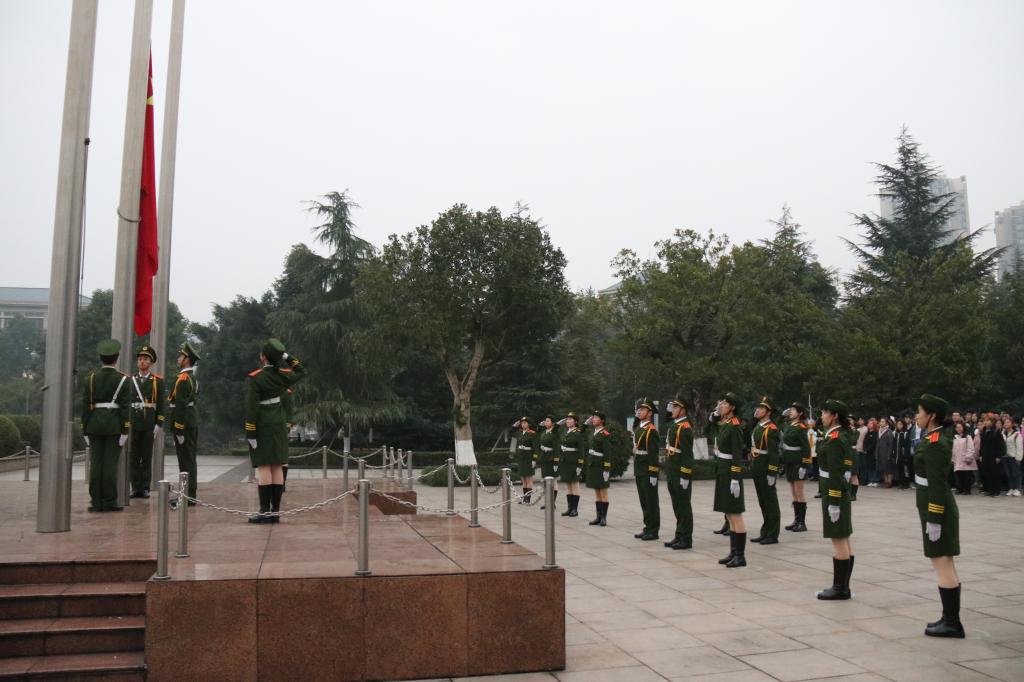 伴随着激昂、振奋的爱国歌曲,国旗班成员迈着整齐的步伐有序入场。天色微明,在庄严的国歌声中,五星红旗冉冉升起,在场的师生敬礼仰注,祖国的历史缓缓随之舒展在眼前,对祖国的自豪感在物电学子心中悄然绽放。