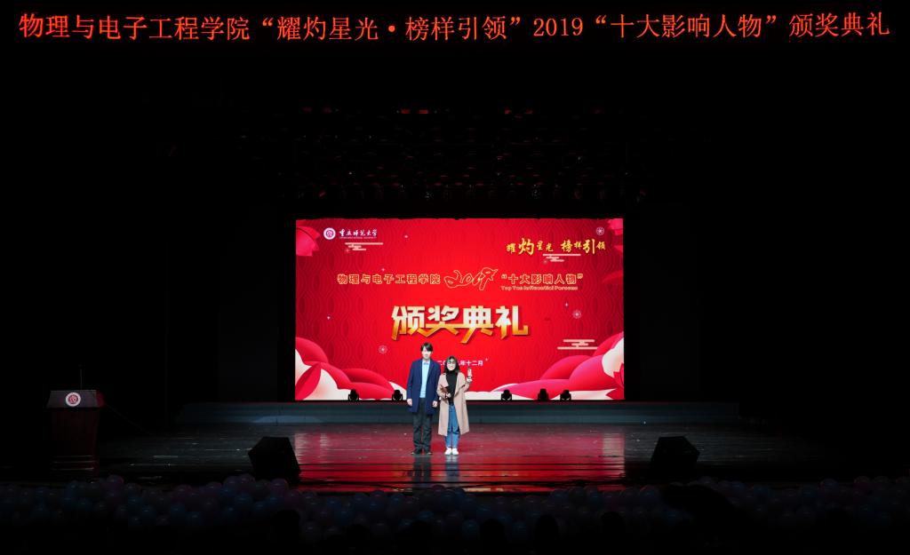 颁奖典礼上,到场各年级学生及莅临嘉宾共同观看了物电学院2019“十大影响人物”个人介绍片,了解了2019“十大影响人物”获奖同学在学业、科研、创新、创业、文体等方面追求卓越、逐梦前行的奋斗历程,听取了他们对物电学子的温暖寄语。随后,学校职能部门领导、学院领导及专业老师分别向2019“十大影响人物”获奖同学致颁奖词并向他们颁发奖杯及证书。