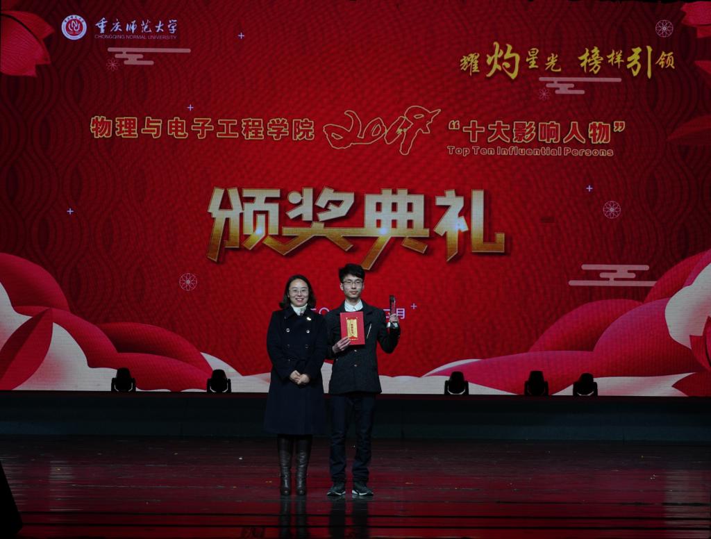 “十大影响人物”获奖代表刘理斯上台发言。刘理斯向曾经帮助过她的老师与同学表达了真挚的感谢。她表示,物电学院是一个温暖的大家庭,虽然身处异乡,但仍能时时刻刻感受到温暖。最后,她借用习近平总书记的话“青年时期选择了吃苦就是选择了收获”,勉励同学们在学习上应勤奋好学,持之以恒;在生活中学会做人、学会做事、学会求知。