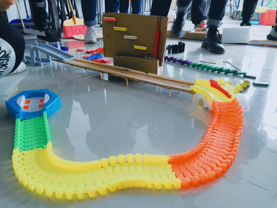 下午2点30分,各决赛队伍陆陆续续将自己的比赛作品带到比赛现场,进行比赛之前拼装和调试。在这短短的19天内,各组参赛成员创造了一个个他们眼中的未来智慧交通世界,从中可以看出作者对现实生活的观察和创造力以及想象力。精致巧妙的机关、形状多样的小车轨道、排列有序的多米诺骨牌、智能Led显示屏、苍劲有力的毛笔字标语等等,一环紧扣一环,扣人心弦。小车翻山越岭,在轨道中来回穿梭,经过红绿灯自动停下、智能送货等无一不体现着未来交通的特点。 精确巧妙的机关设置一气呵成,可谓是“牵一发而动全身”,“四两拨千斤”,令评委和同学们赞不绝口。