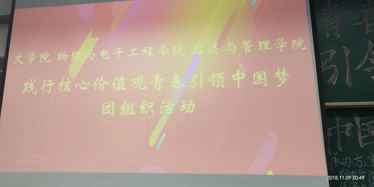 社团部,经济管理学院社团部,文学院社团部在弘德楼15105开展了“践行核心价值观,青春引领中国梦”团组织活动让广大青年在弘扬和践行社会主义核心价值观中勤学、修德、明辨、等实、爱国、励志、求真、力行,同人民一起奋斗,同人民一起前进,同人民一起梦想,用一生来践行跟党走的理想追求。