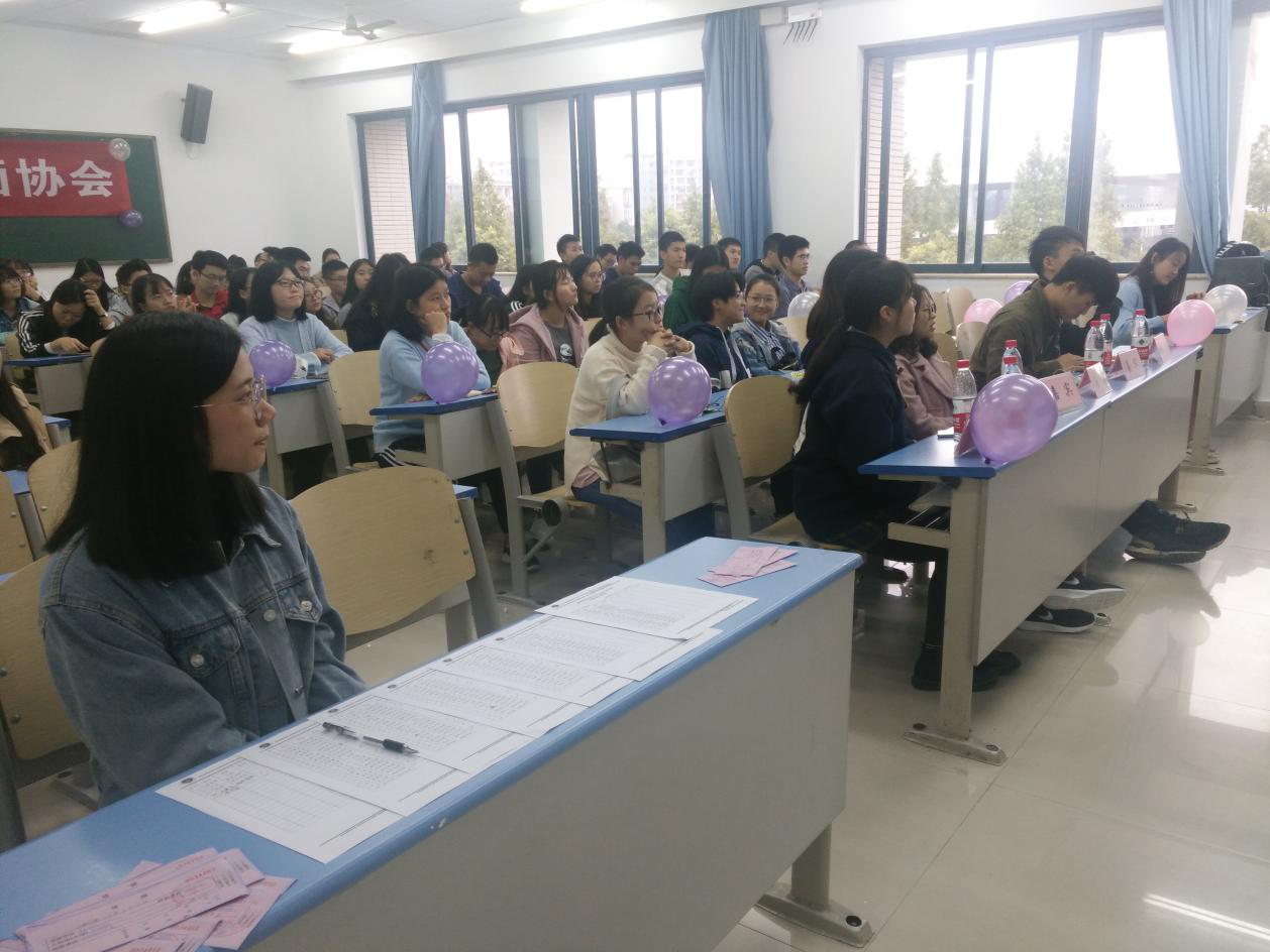 首先开始的是书画协会会长朱婷的致辞先欢迎各位成员的加入。琴棋书画,自古以来便是用来陶冶情操的必备途径。书法和绘画更是拥有悠远的历史,书法是汉字的艺术,绘画是心灵的写照。书画协会将会给予同学们一个很好的平台让同学们可以充分发挥自己的特长和展现自己的兴趣。”接下来,三位同学的舞蹈《小苹果》和协会干事带来的两首歌曲让全场气氛迅速升温,下面进入的是游戏环节。“歌词接龙”与“真假游戏”都让同学们变得更加活跃起来,接龙版“你画我猜”,这个由协会内部亲自改编的与绘画有关的游戏,更是让气氛达到高潮。将主持人给定的词语变为画面,再一个一个的接力画到最后,由末尾的人说出答案,看着“面目全非”的画,那些千奇百怪,莫名其妙的回答常常会引来全场的哄堂大笑。