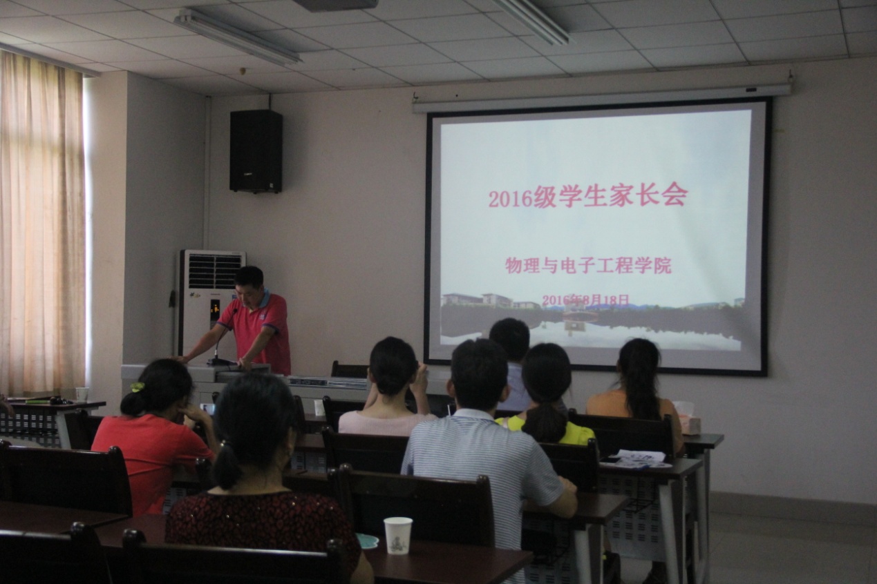 和物电学院的发展历史、校园环境等。“没有功底丰厚的老师,就很难有出色的学生。”唐敏老师坚定地说道。接着,唐敏老师为新生和家长隆重介绍了物电学院优秀的师资队伍,同时也为大家展示了物电学院先进的实验设备。当看到如此优秀的物电学院时,新生和家长表现出了对学院无比的信任。在一系列的介绍之后,冉久飞老师站上讲台,与家长们谈论了“教子之法”。冉久飞老师说:“孩子们到大学最主要的目的就是学会独立,学会为人处世之道。”这个观点得到了在座家长的认同。“孩子和家长应该多沟通,并互相尊重。”老师为家长和新生分享道。