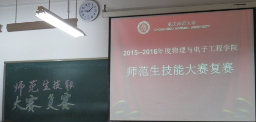 12104教室举行了第四届师范生技能大赛复赛。此次比赛由团总支·学生会及学院各领导审批,由团总支·学生会牵头,学习部和师能素质协会承办,还邀请了12级优秀学长学姐魏品伟,他们分别是:钟杰,原物电辩论队队长,现签约梁平中学;张倒红,组织开展过许多大型活动,获得过华夏杯二等奖;张霞,成绩优异,师范生技能扎实;陈金源,签约涪陵最好的中学——涪陵14中。