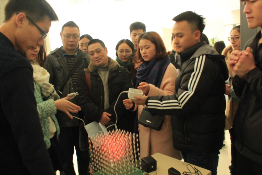 展示开始,整个校友会堂大厅人声鼎沸,从左至右分列了九个展台,每个展台陈列3至5样展品,每一件展品都是耗费了参战选手大量的时间与精力的结晶,大家纷纷向老师同学仔细生动地介绍自己的展品,成品效果也都得到了到场老师同学的肯定。9点30分各评委开始依次为参展作品做出点评,并分别从可行性、实用性、创新性以及可持续性对参展作品给予了中肯的评价与建议。对于物电学院的参展作品“3D脉搏计”,评委表示,此项作品的创新性虽然不够强,但是该作品将健康测定结果具象化,易于非医学专业人士的理解,对此表示了肯定。评委评定的过程让同学们理解了什么是技能,什么是技能的创新,更认识到了科技作品的发明需要切合实际。最后,随着评委参观完最后一件展品,本次本科非师范专业科技展也落下了帷幕。