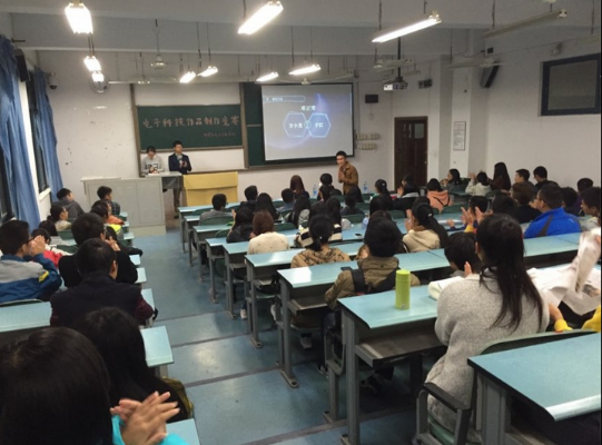 院学生会主席邓正雪学姐上台为同学们加油,鼓劲同学们踊跃参加竞赛。随后,大家积极地与学长们互动,阐述了自己对电子制作的喜爱、理解,并提出了自己的疑惑。最后,报告会在热烈活泼的气氛中圆满结束。