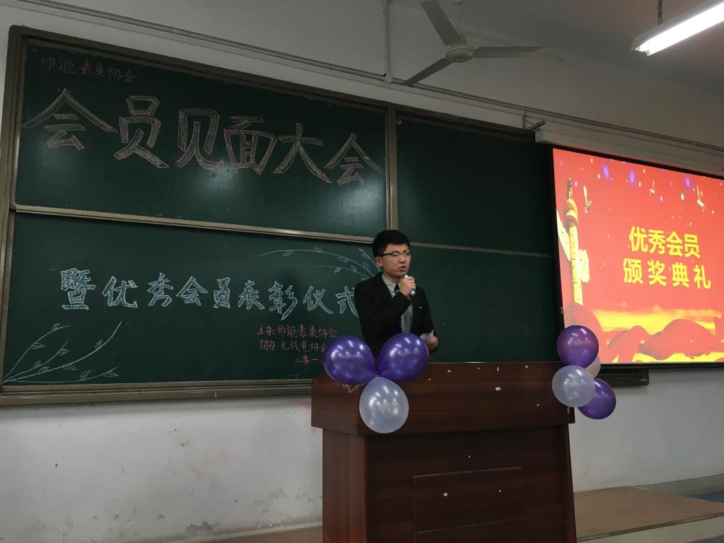 下午1:00,师能素质协会会员见面大会在主持人曹镇麒激情澎湃的开场后正式开始。第一个环节:通过PPT,回顾了协会在往昔举办的特色活动,各个活动的特质所在,并向初来乍到的新会员们对协会作详细介绍,其中包括协会所有的干部干事以及分管部门。在这个过程中,现任会长黄茜对协会往年的工作做了整体的总结及发表了对协会未来的寄语。第二环节:对上一届优秀会员进行颁奖,其中一位优秀会员作为代表发言,分享着她在协会中的点点滴滴,让新会员对本协会更深入的了解。紧接着的是新会员的自我介绍,因为是自愿原则,所以现场争先恐后上台的情况令人大为欣慰。第三环节:轻松而有趣的游戏,虽然会员之间很多都不认识,但踊跃报名参加的人还是很多。最后留下了12个人,让他们自主选择的原则分成两两一组,共六组进行两两之间的较量。“你画我猜”,玩过游戏的人应该都知道这个游戏的规则,它不仅考察词语的积累,语言的表达能力,还十分注重两个人的默契。在游戏过程中,不仅参与的人体会到了快乐,台下坐着的同学也有捧腹大笑的。欢快的时间好像过得更快,在大家的欢声笑语中,游戏环节结束了,同时,也迎来了会员见面会的结束。