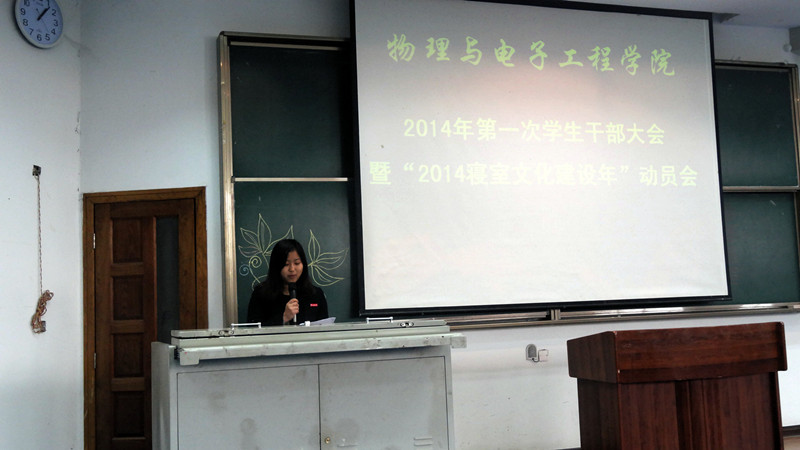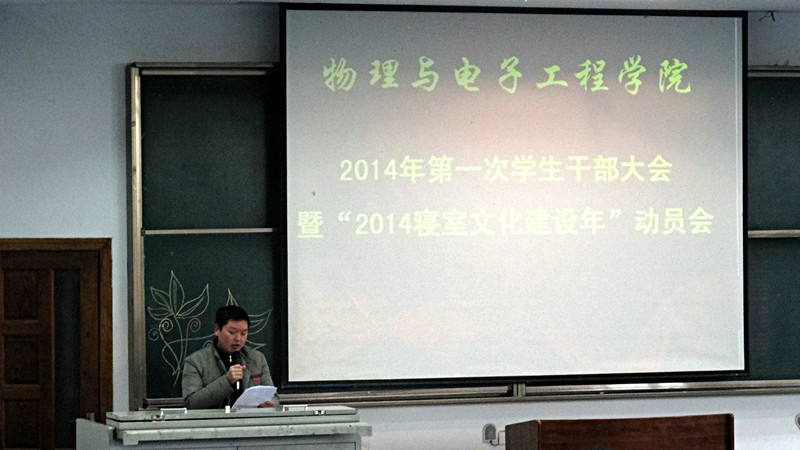 于2014年3月6日下午一点在弘德楼15205举行了新学期第一次学生干部大会暨“2014寝室文化建设年”动员会。此次动员会很荣幸的邀请到学校校学工部部长、学生处处长张明志老师、学工部副部长、学生处副处长唐加祥老师、校学生处学生事务管理科科长李鑫老师、韩国h漫