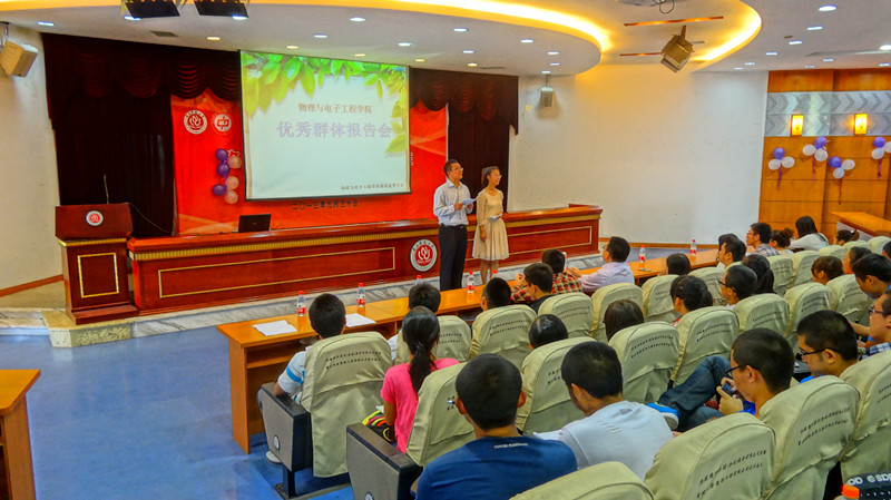 举办的2013届优秀群体报告大会于2013年9月29日下午14:30在弘德楼凯撒报告大厅举行,出席本次大会的领导有学院党总支副书记冉久飞、团总支副书记李青松、学院13级辅员老师。10级、11级、12级优秀的学姐学长也出席了本次报告会;会议时长2个小时,每位参与会议的学姐学长分别上台分享了他们精彩、充实、丰富的大学生活,并寄希望于13级新同学,给予他们新的力量和动力。