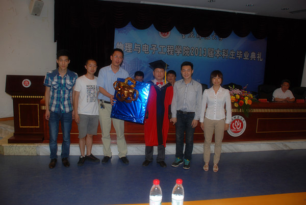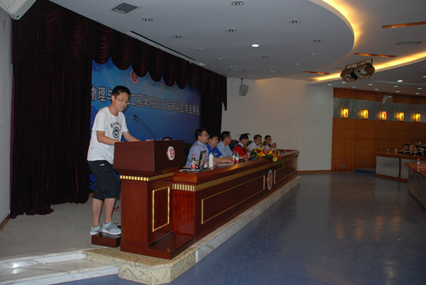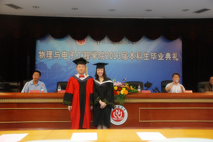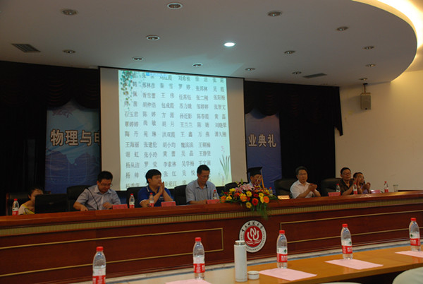 典礼开始,在冉书记激情洋溢的开场白之后,众人一起观看了2009级毕业生毕业纪念视频,一起回忆,懵懵懂懂的大一,轻舞飞扬的大二,壮志凌云的大三,青春无悔的大四,那点点滴滴都是是数不完的欢乐,道不尽的成长。然后,唐敏书记就大家四年内的优异表现进行总结,肯定了09级同学们在学习上的努力与付出,并宣布优秀(良)毕业生和考取研究生名单。接着,学院学术委员会主席崔玉亭教授宣布授位决定,依次为同学们进行了神圣的授位仪式。在大家的一阵阵欢呼声中,教师代表苑进社教授走上台发言。苑教授回顾过去四年里与同学们在一起的学习生活,对大家积极向上、求实进取的学习态度进行褒奖。并用这么一段话,鼓励毕业的同学们——“过去的四年里,在老师和同学们的积极配合下,很多同学的物理思维能力更加敏捷。在未来,还有广阔的科研环境等着大家的加入,大家应该更加努力朝着梦想的方向前进。”紧接着,毕业生代表汪洋饱含对学校、学院的感谢之情和同窗四年各奔天涯的不舍之情的发言,讲出了毕业生们的心声。在重师,他们学习到了“学高为师、身正为范”的精髓所在;在物电学院,他们学到了“志存高远、脚踏实地”的成功秘诀。