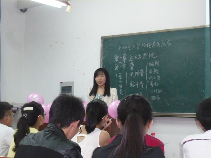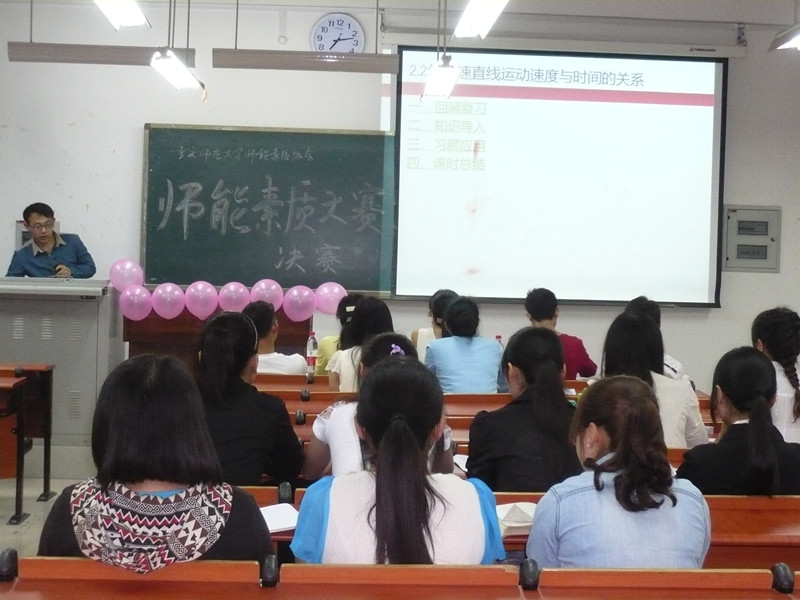 比赛于7点正式开始,主持人介绍了此次比赛的比赛规则,评分细则和奖项设置,并隆重介绍了此次比赛的评委团,他们分别是来自各个学院师能素质能力强的高年级学姐学长。此后,各参赛选手按顺序依次上台,本次比赛主要采取板书和PPT两种形式相结合的方式;在讲课主题方面,选手们都讲着与本专业有关的知识点:平抛运动、古诗的鉴赏、二次函数、氨基酸的性质等。比赛过程中有问有答,评委们的现场提问及点评让选手们认识到了自身不足的同时也发现了自己的优点,现场气氛非常活跃。比赛结束后评委代表管华对本次活动做了点评,肯定了大家的成绩和努力,同时也从侧面提出了不足。最后主持人公布了比赛的结果,并由评委们颁发了相应的证书,本次师能素质大赛成功落下帷幕。