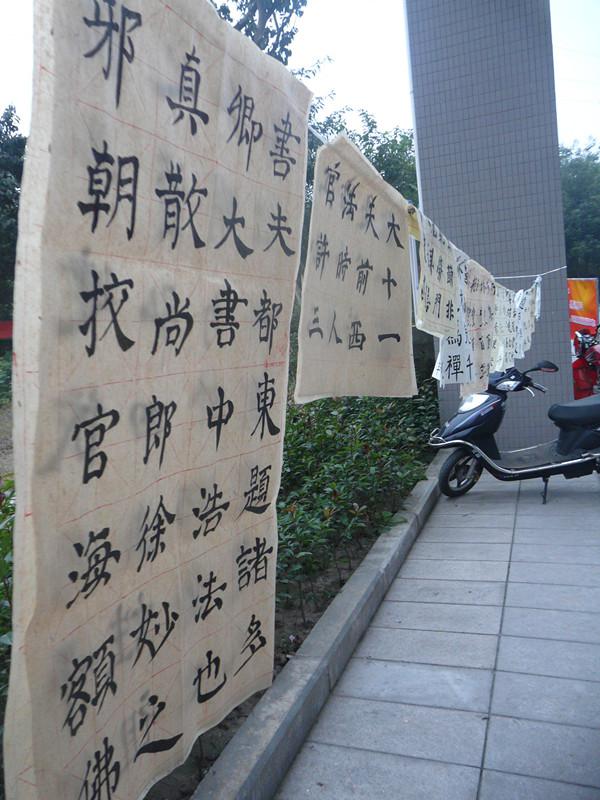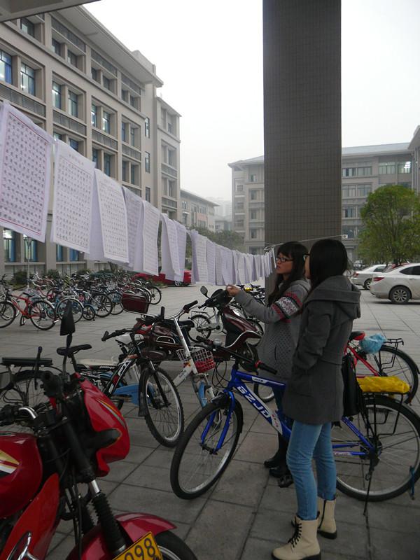 于9栋楼下进行了为期两天的上半学期三笔字训练成果展,引得过路的同学们纷纷前来围观,发出阵阵惊叹。