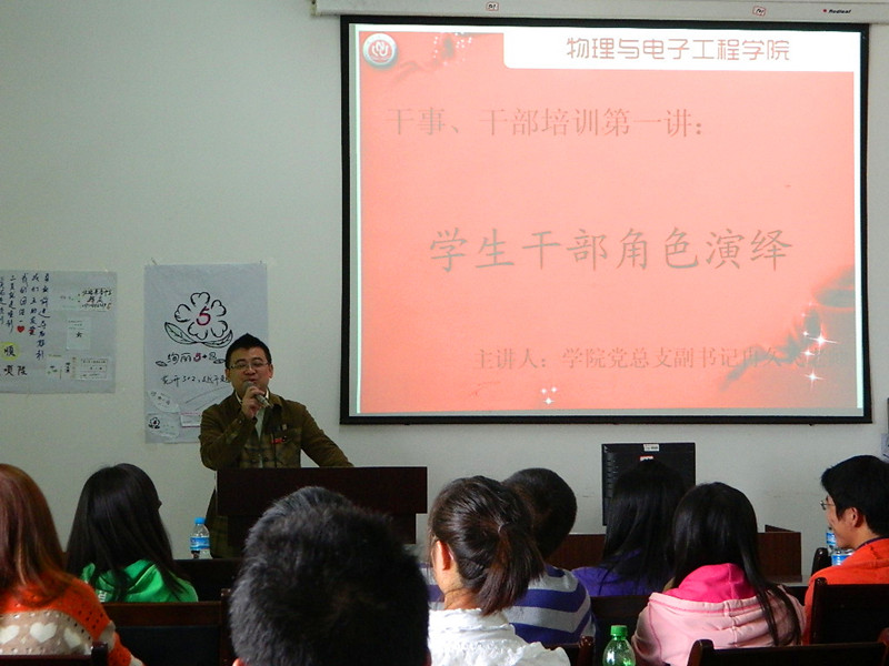 首先,由主持人宣布开班仪式正式开始,并一一介绍到场嘉宾。接着,由团总支副书记李青松老师讲话。李老师总结了2012-2013届学生会成立以来取得成就与存在的问题,并对各部门干部和干事提出了要求与希望。接下来,2011-2012届团总支学生书记李佩学姐以朴实无华的语言对学生会新成员提出了几点建议,内容包括如何处理学习与工作的关系,如何对自己进行正确的定位以及如何处理与同学和老师的关系。也许是因为同是学生干部,李佩学姐的一番话引起了同学们强烈的共鸣。接着是新进干事代表赵亚莉发言。现在依旧青涩的她用坚定的声音道出了大多数新进成员的心声。最后,党总支副书记冉久飞老师做了主题为“学生干部意识培养”的讲座,其主要内容涉及做事、做人的各个方面,对同学们有十分深刻的教育意义。