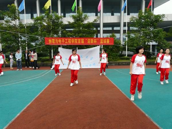 首先,主持人陈应鹏带来一段开场白后,大方又可爱的篮球宝贝们上场为大家带来了热辣的开场舞,迎来了一阵又一阵哗啦啦的掌声,瞬间把现场的气氛推向了高潮,火红的着装让她们向跳动的火焰越烧越烈,展示出90后活泼、青春、热情的一面。舞蹈之后,主持人宣布开幕式正式开始,并且请出了出席开幕式各位嘉宾。冉久飞老师亲切地问候了大家,并极大地赞美了大家勇于奋斗、敢于拼搏的精神,同时告诫大家比赛第一、友谊第二、重在参与。随后,团总支·学生会主席张磊代表全体运动员宣誓:他们将认真对待比赛、友好对待对手……同时为了保证比赛的有序进行,裁判员黄文陶上台宣誓,开始到这里已经接近尾声。之后,队员们在队长的带领下高呼口号,响彻整个体育场,终于在观众们的呐喊声和掌声中,整个开幕式圆满结束。