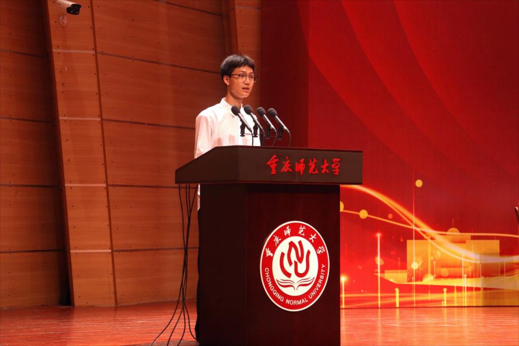 2024级电子信息科学与技术专业秦文强同学代表新生发言。他表示,要刻苦学习专业知识,努力提升专业技能,在学科竞赛、科研实验中勇攀高峰,争做会理论的实践者、会实践的思想者,不断磨炼本领,奋力书写物电人挺膺担当的青春篇章。
