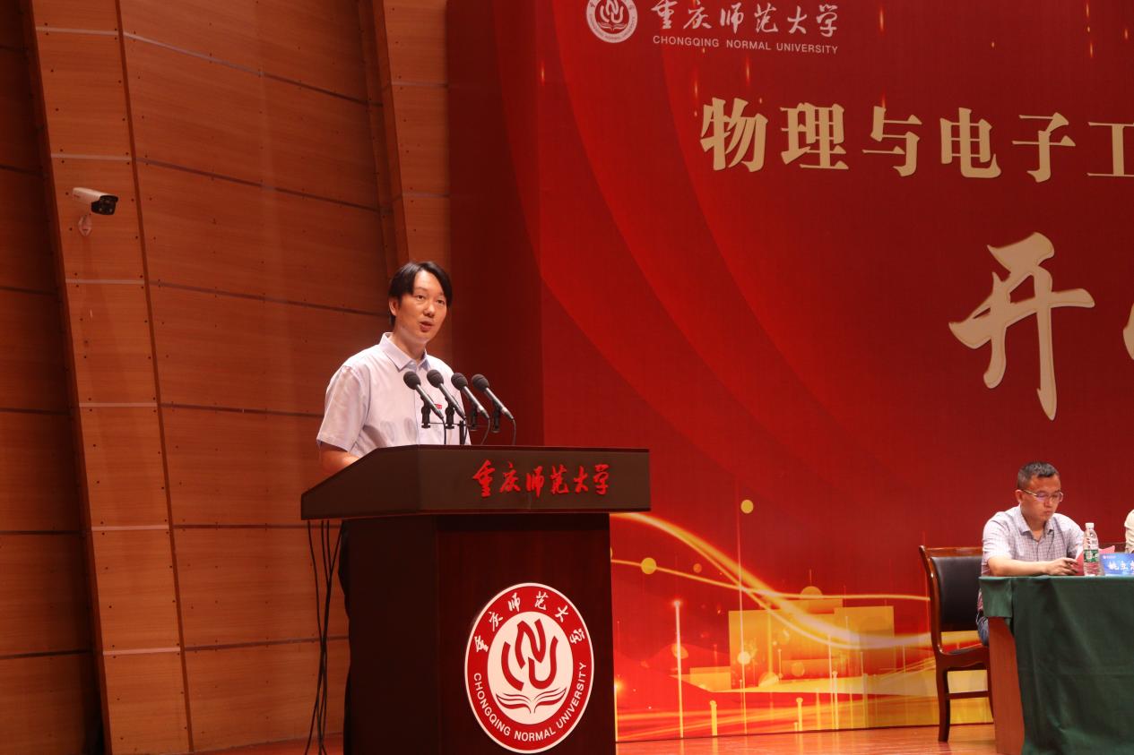 随后,教师代表姚立忠老师上台致辞。他从分享了自己从普通乡村学生到高校教师的奋斗历程,勉励每一位物电学子要胸怀大志,矢志奋斗,勇担科技发展、国家振兴的重任。他鼓励同学们充分利用学院教育资源,不断学习,努力提升综合素质,早日成长为祖国需要的栋梁之材。