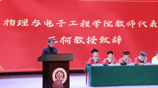 王珂教授代表全院教师致辞。他祝贺全体毕业生顺利完成学业,并以自身奋斗经历勉励毕业生们坚定理想信念,追求美好人生,勇敢面对未来的挑战。