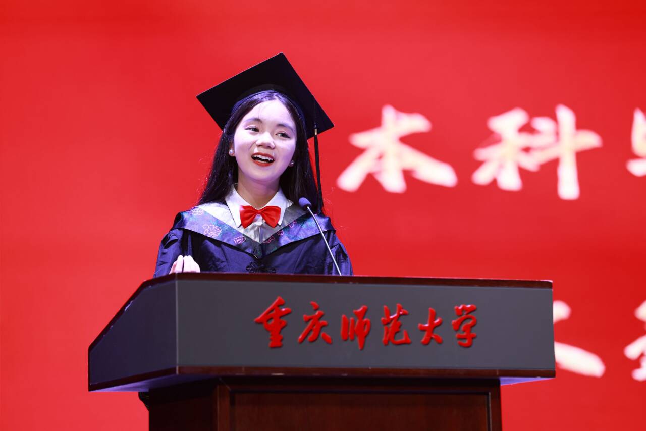 本科毕业生代表邱文鑫同学在发言中深情回顾了在物电学院度过的美好时光,表达了对母校、师长和同窗的感激之情,并表示将带着勇担时代的使命,在未来的学习和工作中努力拼搏、追求卓越。