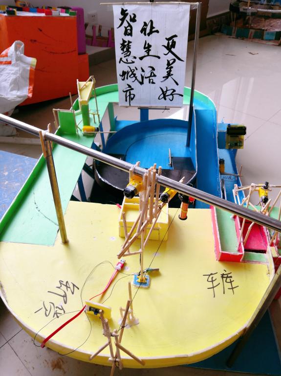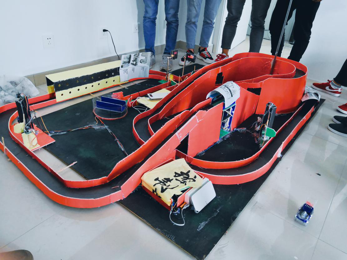 下午2点30分,各决赛队伍陆陆续续将自己的比赛作品带到比赛现场,进行比赛之前拼装和调试。在这短短的19天内,各组参赛成员创造了一个个他们眼中的未来智慧交通世界,从中可以看出作者对现实生活的观察和创造力以及想象力。精致巧妙的机关、形状多样的小车轨道、排列有序的多米诺骨牌、智能Led显示屏、苍劲有力的毛笔字标语等等,一环紧扣一环,扣人心弦。小车翻山越岭,在轨道中来回穿梭,经过红绿灯自动停下、智能送货等无一不体现着未来交通的特点。 精确巧妙的机关设置一气呵成,可谓是“牵一发而动全身”,“四两拨千斤”,令评委和同学们赞不绝口。