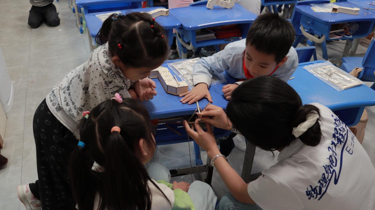 活动伊始,志愿者以生活中常见的物理现象为引,用生动有趣的语言点燃了孩子们的好奇心,逐步揭开实验主题的面纱。随后,孩子们在志愿者的带领下,分组展开三个经典物理实验的探索与制作。