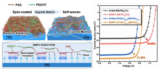 近年来,以PEDOT:PSS空穴传输层的倒置钙钛矿太阳能历近十年的发展,已经成为制备工艺更为简单,无迟滞器件的代名词。PEDOT:PSS的报道均指出其作为空穴传输层会影响钙钛矿的稳定性,众多科研学者报道了大量关于应对PEDOT:PSS能级匹配、界面接触、酸性等问题的解决方案。然而,无论如何修饰,均难以实现高效和高稳定性的兼容。在本项研究中,提出聚离子自编织的制备方法ITO基片上首次获得了致密的单层网状PEDOT:PSS膜,并以其为空穴传输层有效改善了PEDOT:PSS的成膜结构MAPbI3(Cl)为钙钛矿吸光层制备了倒置结构的钙钛矿太阳能电池。在器件的应用中,能级结构、界面接触、酸性等问题得到同时解决,与此同时,共形的单层PEDOT:PSS网,还有助于减小PEDOT:PSS在器件内部的光学干涉损失。该工作为单层PEDOT:PSS网的制备提供了新的方法,助力倒置钙钛矿太阳能电池的产业进程。相关结果发表在 Chem. Eng. J. 2022, 428, 132074