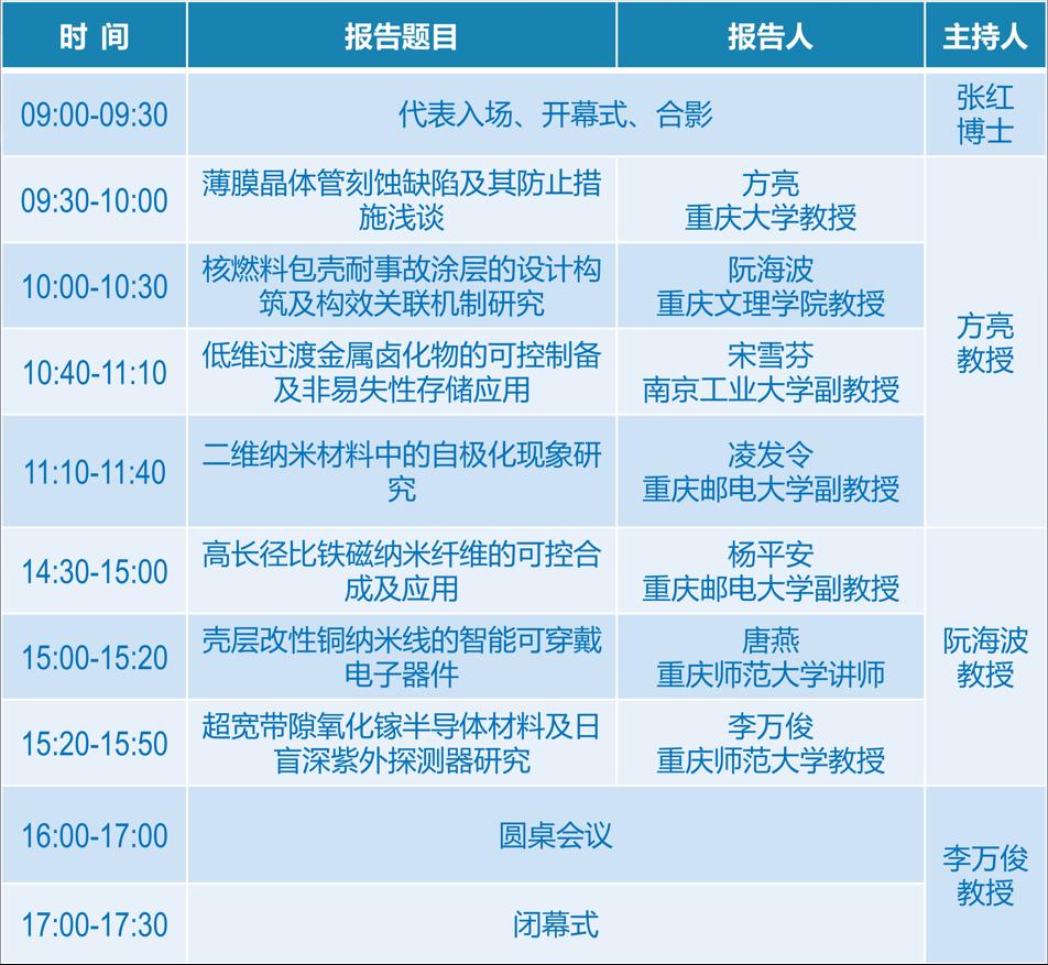 重庆大学方亮教授在报告中介绍了TFT叠层电极刻蚀缺陷的研究现状,并讨论其防止措施及相关科学问题;重庆文理学院阮海波教授以“核燃料包壳耐事故涂层问题的提出及研究现状”为题做专题报告,介绍其课题组在核燃料包壳耐事故涂层方面最新研究进展;南京工业大学的宋雪芬副教授介绍了低维过渡金属卤化物的可控制备及非易失性存储应用并分享其课题组在二维过渡金属卤化物及其在非易失性存储中的工作进展;重庆邮电大学凌发令副教授对二维纳米材料中的自极化现象对材料的电子结构、输运、表面活性等性质的影响做专题报告;重庆邮电大学杨平安副教授介绍了磁场辅助原位还原合成高长径比铁纳米线及包覆、轻质宽频带吸波涂层设计和柔性触觉传感器设计及应用;韩国h漫