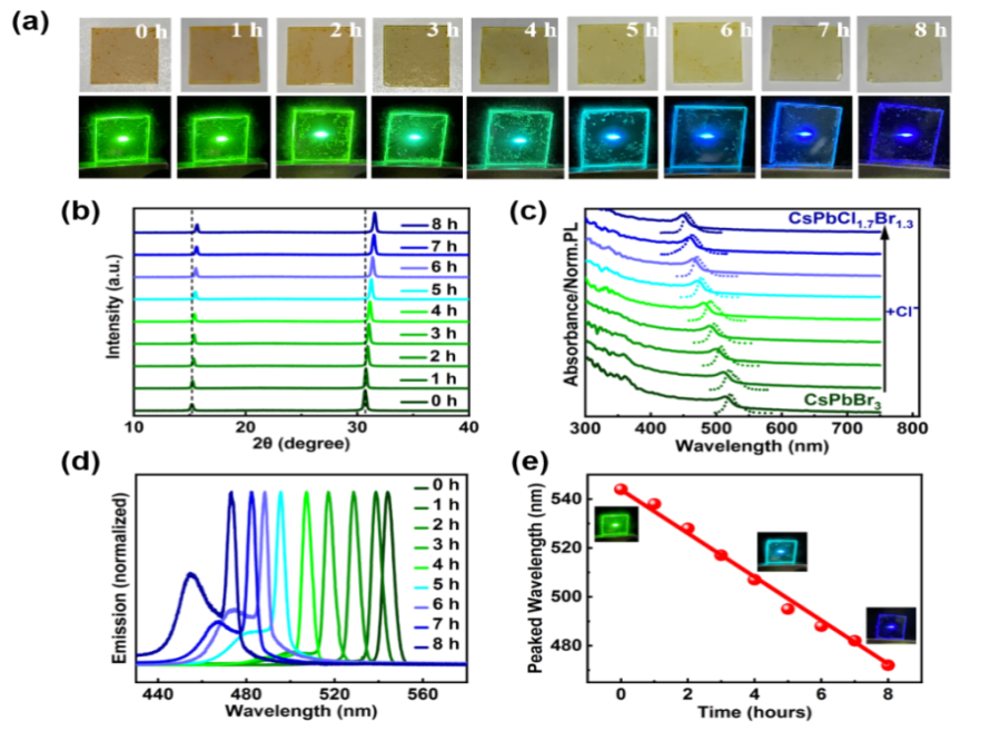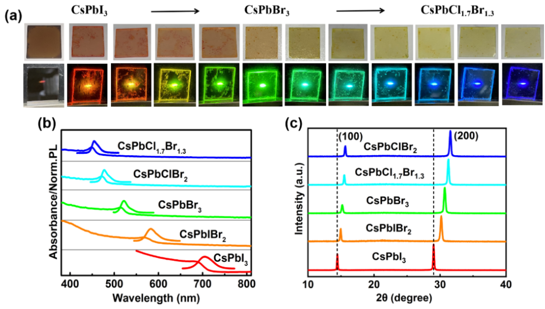 全无机卤化铅钙钛矿(LHPs)由于具有高吸光系数、高荧光量子效率、窄半峰宽、简单全溶液处理等优点,在光电和光伏器件领域具有广阔的应用前景。根据分子特性,混合卤化物钙钛矿CsPb(Cl/Br)3和CsPb(Br/I)3可以在CsPbCl3、CsPbBr3和CsPbI3之间通过快速阴离子交换法得到整个可见光谱区域的明亮光发光(PL)。这种反应通常在液相进行,特点是反应速率快,使其难以持续和准确地控制卤素比。已有研究尝试调节液相反应中的阴离子交换反应速率,交换反应过程速度仍然太快,难以控制晶体动力学生长过程,也没有办法连续准确地控制卤素比。然而,减缓阴离子交换反应过程将有效地减少薄膜的表面缺陷状态,促进具有良好形貌和结晶度的高质量薄膜的形成,这有利于应用于光学放大器和激光器。