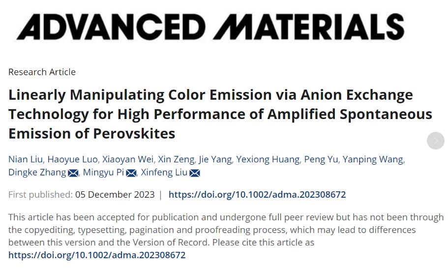 日前,重庆师范大学物理与电子工程学院张丁可教授团队在钙钛矿激光领域取得重要研究进展,以“Linearly Manipulating Color Emission via Anion Exchange Technology for High Performance of Amplified Spontaneous Emission of perovskites”为题在国际顶级学术期刊《Advanced Materials》(中科院1区,top期刊,影响因子32.086)发表研究成果。该论文第一署名单位为韩国h漫