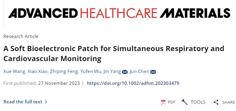 为第一单位在国际期刊《Advanced Healthcare Materials》(中科院一区TOP期刊,影响因子10.0)上发表题为“A soft bioelectronic patch for simultaneous respiratory and cardiovascular monitoring”的学术论文,物电学院青年教师王雪博士为第一作者。