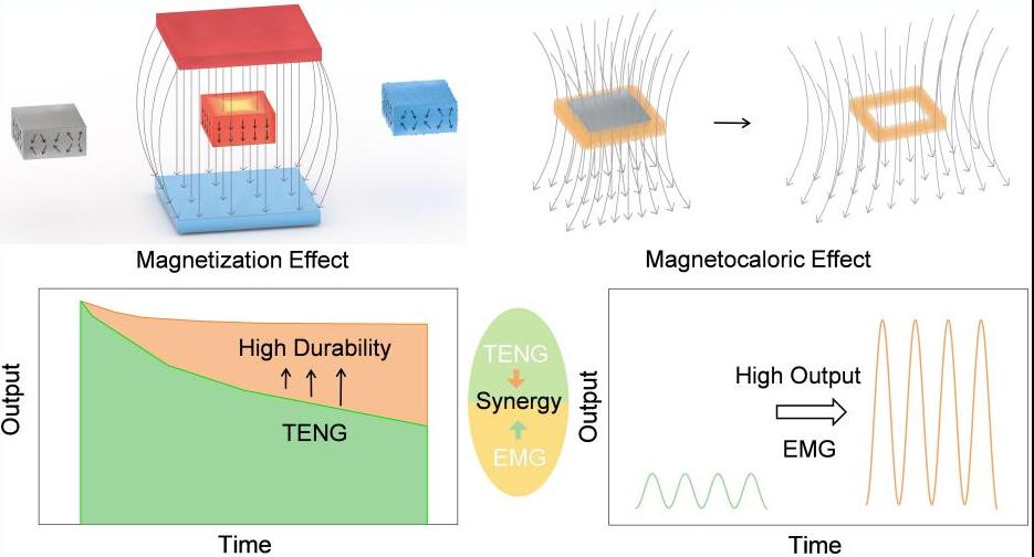 研究团队创新性地提出了一种利用金属钆Gd的磁卡效应和磁化行为实现热量的定向传导从而达到性能自增强的纳米发电机。利用Gd的磁卡效应构建了一种高效的传热机制来抑制摩擦层温度的升高,增强器件的输出稳定性。经过80小时的连续运行,优化后纳米发电机的电荷衰减率仅为每小时0.32%,稳定性明显优于目前报道的大多数TENG。同时,Gd的磁化行为将电磁发电机的瞬时功率提高了约80.84%。这项工作通过内部组件相互增强实现了1+1>2的协同效应,为发展强耦合的杂化发电机提供了一种通用的解决方案。