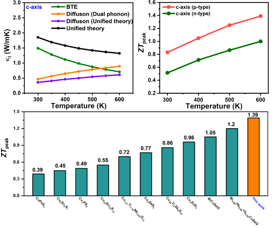 靳鑫博士面向开发高性能经济环保热电材料的研究焦点,以“Anomalous thermal transport and high thermoelectric performance of Cu-based vanadate CuVO3”为题发表在《Applied Physics Letters》上发表最新研究成果。该研究探索了过渡金属钒酸盐CuVO3的反常声子输运和热电性质,得益于价带边缘多能谷和大的电子态密度使其具备较大的塞贝克系数,实现了空穴掺杂CuVO3中较高的功率因子,在300 K至600 K的温度范围内平均热电优值超过1,高于大部分目前报告的铜基热电材料。