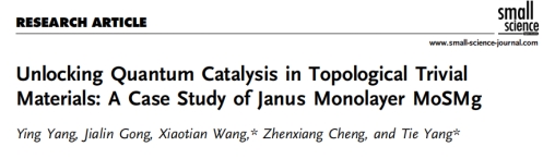 为第一单位在《Small Science》上发表题为“Unlocking Quantum Catalysis in Topological Trivial Materials: A Case Study of Janus Monolayer MoSMg”的最新研究成果。《Small Science》是WILEY在2021年最新推出的纳米领域开放获取顶尖旗舰期刊,最新影响因子为11.1。《Small Science》旨在成为大科学时代国际高质量的跨学科科研技术交流平台,致力于报道来自纳米科学和纳米技术各个领域最具影响力的研究成果。