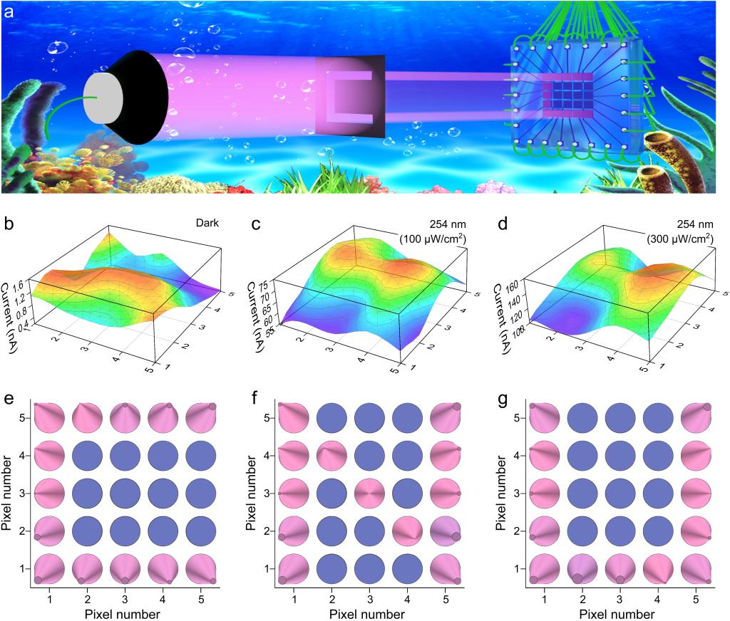 图为:非晶态Ga2O3日盲光电探测器在水下成像的概念验证演示 |