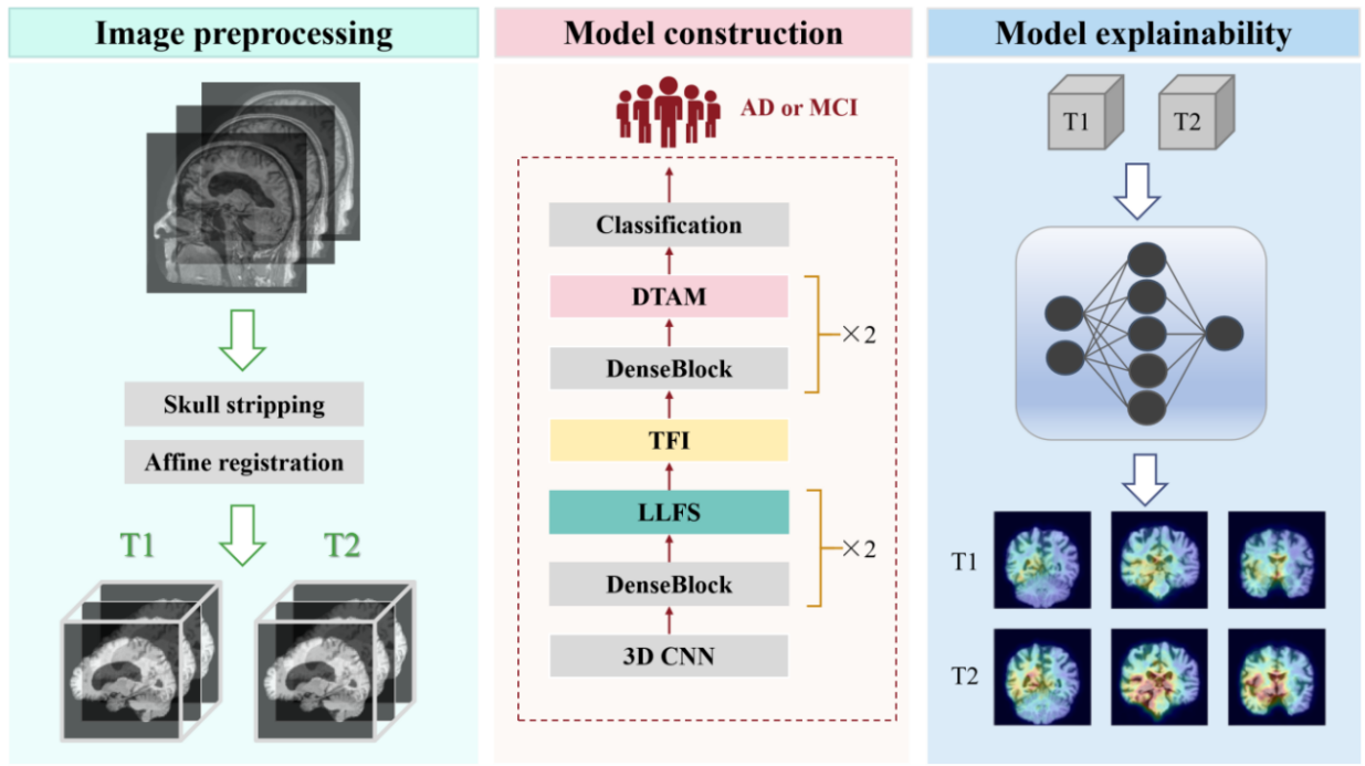 在第二篇论文Attention-guided 3D CNN With Lesion Feature Selection for Early Alzheimer's Disease Prediction Using Longitudinal sMRI中,姚立忠副教授介绍了一种新颖的轻量级三维卷积神经网络,专门用于捕捉脑疾病的演变,以预测轻度认知障碍(MCI)向阿尔茨海默病(AD)的进展。该模型采用纵向病变特征选择策略,从时间数据中提取核心特征,并引入疾病趋势注意机制,使模型更加专注于病变特征。同时,采用疾病预测可视化技术,提高了最终预测的可解释性。实验结果表明,该模型在曲线下面积(AUC)、准确率、特异性、精确率和F1分数等方面均达到了优秀的性能,仅需利用两个随访的结构性磁共振成像(sMRI)扫描就能准确预测MCI患者24个月后的疾病状态。
