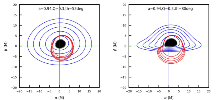 郭森博士及其研究团队主要探讨了克尔-纽曼(Kerr-Newman)黑洞周围薄吸积盘的成像特征,尤其分析了黑洞电荷、旋转及观测者视角对成像的影响。通过射线追踪技术和椭圆积分等数学工具,研究团队模拟了光子在KN黑洞周围的运动轨迹,生成了在不同条件下的黑洞图像。