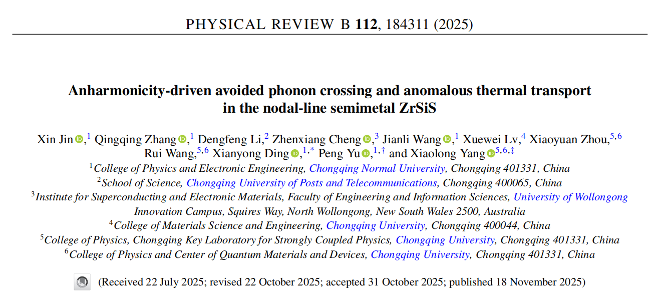 在国际期刊《Physical Review B》(物理类自然指数期刊)上发表题为“Anharmonicity-driven avoided phonon crossing and anomalous thermal transport in the nodal-line semimetal ZrSiS”的研究论文。论文由韩国h漫