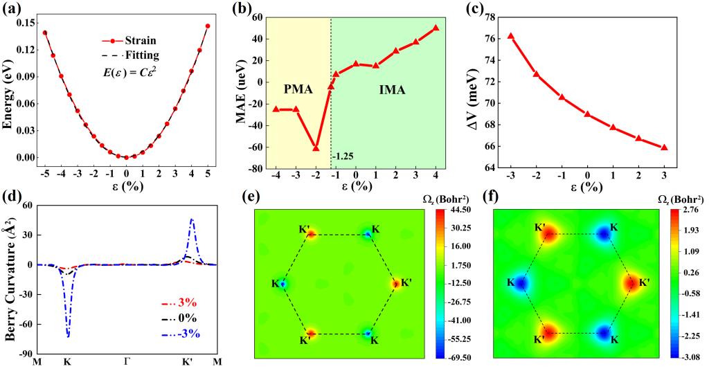本研究基于第一性原理计算,提出一种新型二维Janus结构的 TiSBr单层,其为集铁谷、量子反常霍尔效应以及反常能斯特效应于一体的多功能材料。计算结果显示,该材料具备355 K的高居里温度,能够在室温以上维持稳定的铁磁有序状态;在面外磁矩取向的作用下,体系产生68.94 meV的较大谷极化,并呈现出显著的反常谷霍尔效应。此外,通过双轴应变调控,可实现拓扑相变、量子反常霍尔效应以及反常能斯特效应的高效协同与可逆切换,为发展室温、低功耗、多功能集成的谷电子学与自旋电子器件提供了关键的理论依据。